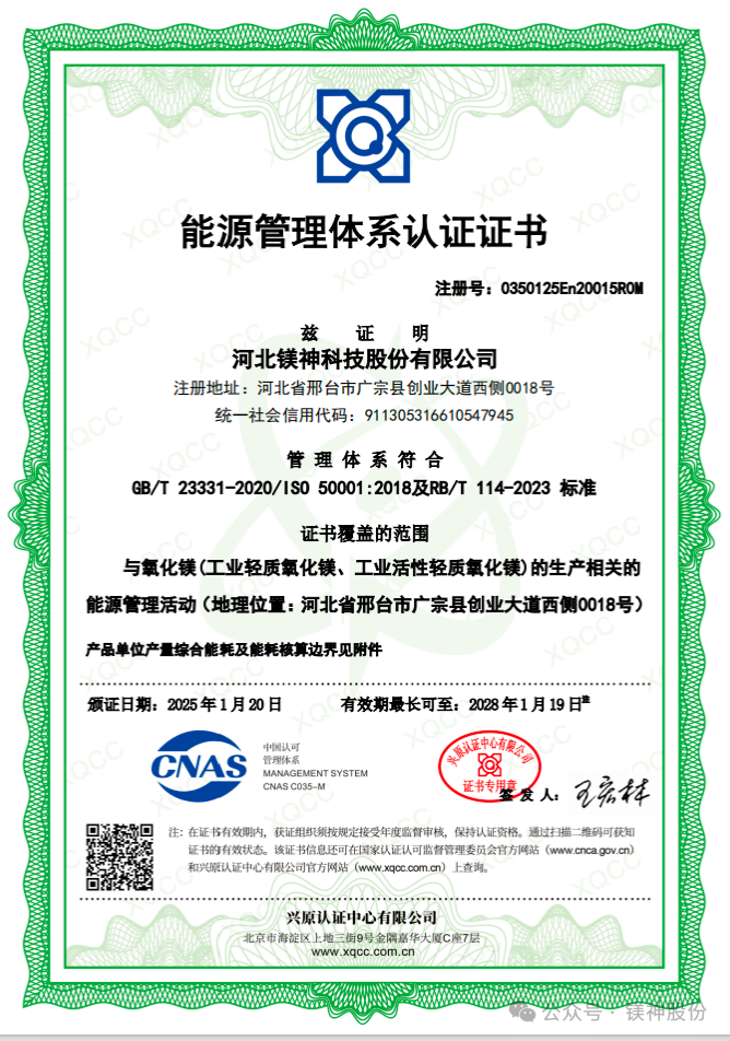 近日,河北鎂神科技股份有限公司獲能源管理體系認證證書,成為行業(yè)內(nèi)首家通過這一重要認證的企業(yè)。這標志著公司在能源管理體系建設(shè)方面達到了新的里程碑,進一步鞏固了其在氧化鎂行業(yè)的領(lǐng)先地位。